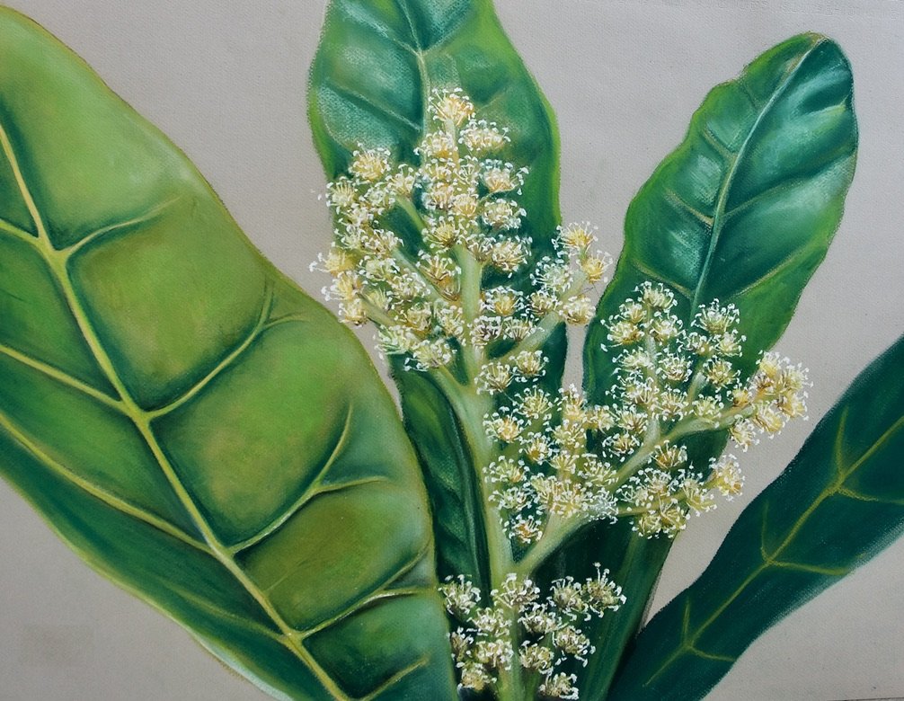 Ida McComish was a naturalist who spent time on Norfolk during the early 1920s. Together with her husband James, she collected endemic botanical specimens for several well-known Herbariums and Natural History Museums overseas. In 1928 she produced her first hand-made album, showcasing the unique flora and fungi of Norfolk. This drawing appropriates a page from that album (which features a female specimen of a mangrove plant, locally known as the Melky Tree) together with my own drawing of the male flower of the same species, which grows in coastal regions throughout the Indo-West Pacific.